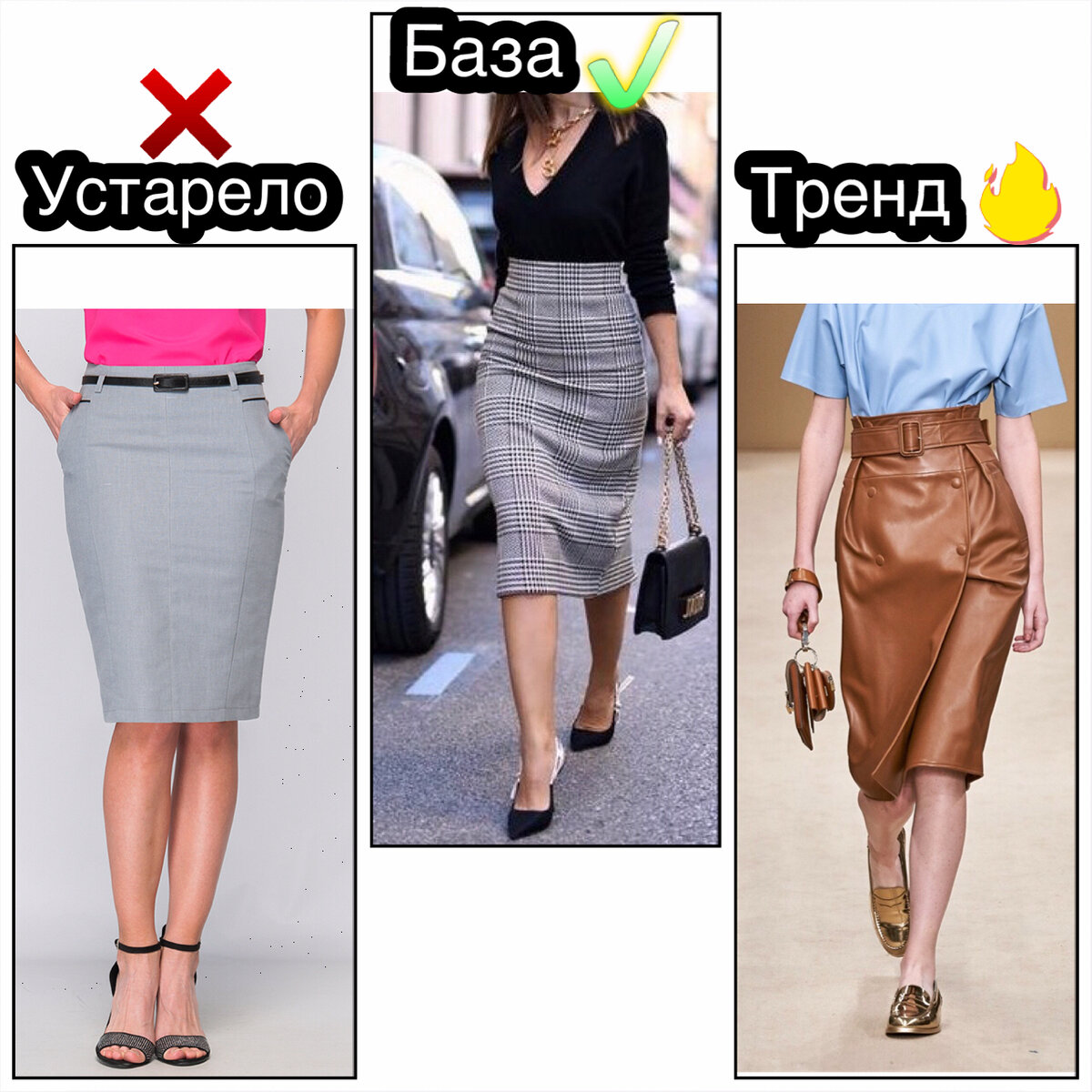 Всем привет!) Сегодня хочу сделать 2 часть наглядных коллажей. В этот раз мне хочется пояснить, что значит "устарело/современная база/тренд". Смотрите, устаревшие вещи - одежда несовременного кроя. Она может оказаться в современной моде, но не раньше 5 лет. И будет изменена в некоторых деталях. Современная база - вещи актуального кроя, которые будут таковыми ещё лет 5. Тренды - направление. Обычно они короткие и задерживаются максимум на пару лет. К такой одежде нужно присматриваться осторожно, т.к то, что в тренде сегодня, может оказаться антитрендом через месяц. Редко, но случается такое, что тренд переходит в базу. Потому современный гардероб лучше строить по принципу: 80% современной базы + 20% трендов. А если у вас в гардеробе есть вещи неактуального кроя, то их можно "реанимировать" с помощью современной базы и нескольких трендов. Тогда пропорция будет: 20% неактуальных вещей + 60% современной базы + 20% трендов. Так вы всё равно будете выглядеть современно и стильно. Юбк