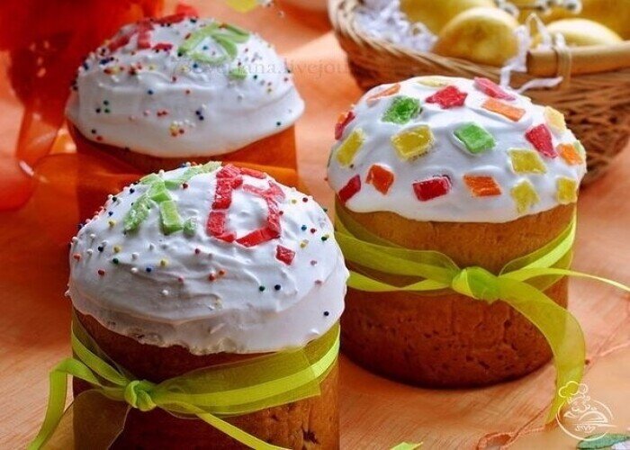 Для глазури просто взбейте белки и сахар. Теплые куличи покройте глазурью, присыпьте цукатами и наслаждайтесь вкусным и традиционным блюдом.