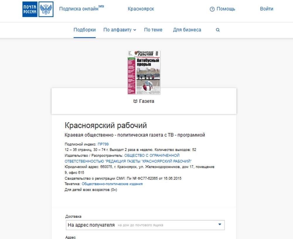 В дни вынужденной самоизоляции мы убедились, что подписка — самый верный способ получения прессы. Ещё раз напоминаем читателям: подписаться на газету "Красноярский рабочий" можно без посещения почтового отделения. Подробная инструкция: * наберите в интернет-поисковике словосочетание "Подписка онлайн" или сразу зайдите на сайт "Почты России" по адресу https://podpiska.pochta.ru/press/%D0%9F%D0%A0799 * укажите в поисковой строке название газеты - "Красноярский рабочий" * определитесь, на что будете подписываться - на двухразовый выпуск (2 номера в неделю) или только на "толстушку" с ТВ-программой, которая выходит по средам; * в самой верхней строке укажите название населённого пункта, в котором вы проживаете или где проживают ваши родственники, друзья, знакомые, которым вы хотите оформить подписку,-- в любом регионе России; * в графе "Доставка" выберите, куда вам будут доставлять газету - на домашний или рабочий адрес, в почтовое отделение до востребования, или "Красноярский рабочи