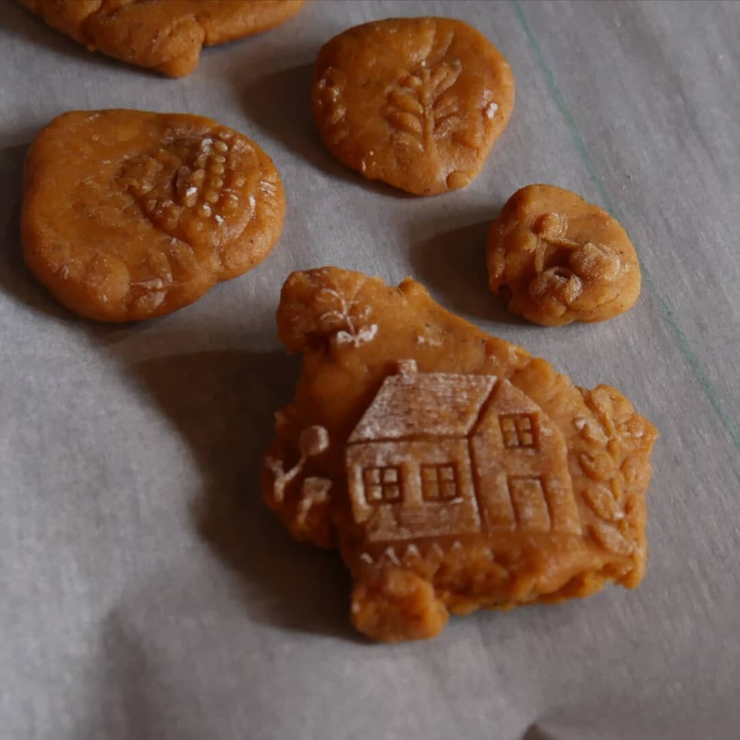 Доставайте тесто, отщипывайте, катайте в ладошках шарики и делайте оттиски. Выпекайте печенье при 180°, до лёгкой румяности.