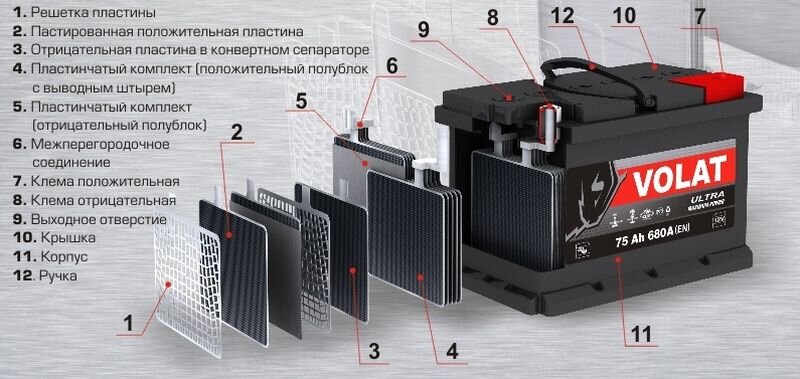 Аккумулятор – это контейнер который состоит из шести отдельных секций. Каждая отдельная секция представляет собой отдельный источник питания (вырабатывает каждая секция около 2,1В), внутри секции находятся две пластины (сделаны из свинца), положительная и отрицательная, отделенные друг от друга. Масса аккумулятора состоит из: веса электролита, свинцовых пластин и соединений, и составляет примерно 16-17 кг.
