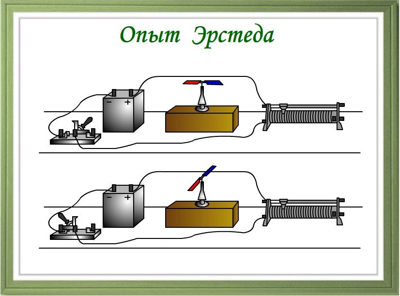 В пространстве вокруг проводника с током (а в общем случае вокруг любого движущегося электрического заряда) возникает магнитное поле. Магнитное поле– это особый вид материи, невидимый и неосязаемый для человека. Также можно сказать, что это силы взаимодействия между проводниками с током. Опыт Ханса Кристиана Эрстеда показал, как взаимодействуют проводник с током и магнитная стрелка: при замыкании электрической цепи магнитная стрелка отклоняется от первоначального положения, а при размыкании цепи магнитная стрелка наоборот, возвращается в первоначальное положение. Можно сказать, что магнитное поле возникает вокруг движущихся электрических зарядов, а электрический ток и магнитное поле неотделимы друг от друга. Чтобы изучить магнитное действие тока, пользуются магнитной стрелкой. Магнитная стрелка– это устройство, представляющее из себя маленький магнит (установленный на острие иглы) и имеющее два полюса (северный и южный). Магнитная стрелка может свободно вращаться на кончике иглы. Л