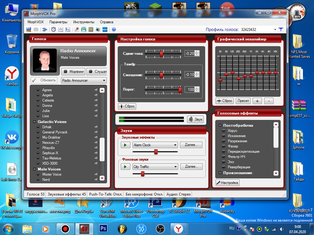 Сегодня я вам расскажу как поменять свой голос в чат рулетке, ВК Для начала нам нужно скачать программу MorphVOX ProorphVOX Pro Далее заходим на винде-> Записывающие устройства Дальше мы ставим Screaming be Audio по умолчанию. Заходим в Чат рулетку, открываем настройки микрофона, далее выбираем Screaming be Audio. Отлично. Теперь поменяем голос в ВК заходим в ВК и просто отправляем голосовое сообщение, нечего не нужно менять. в windows на записывающем устройстве стоит Screaming be Audio по умолчанию Важно всё это делать на компьютере! Как разговаривать с друзьями с изменённым голосом !? Ответ прост. Нажимаете Морфинг Далее Скачиваете Vk Messenger - https://vk.com/messenger Звоните другу, уверяю вас что ваш друг точно удивится! Спасибо что прочитали данную статью. скоро выйдет статья про кряк MorphVOX Pro + плагины и дополнительные звуки,голоса.
