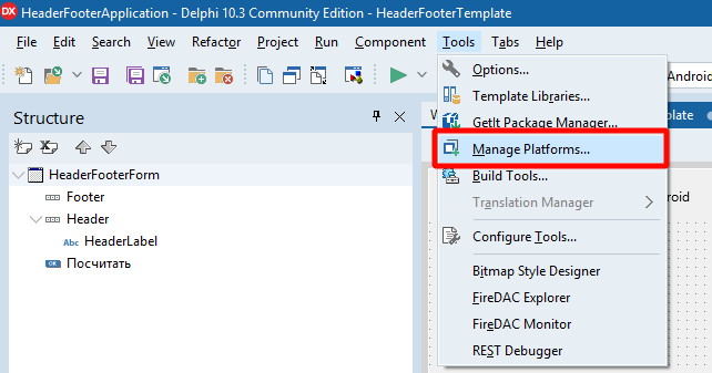 Установим все необходимые инструменты для разработки. Нажмите в главном меню Tools — Manage Platforms