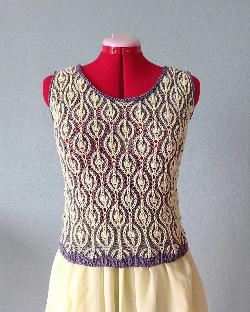 Плечевые петли переда и спинки соединяем «трикотажным швом». Поскольку убавлений с обеих сторон было одинаковое количества, у нас должно совпасть количество петель на плечевых линиях. Небольшой скос плеча формируем во время последующей блокировки.