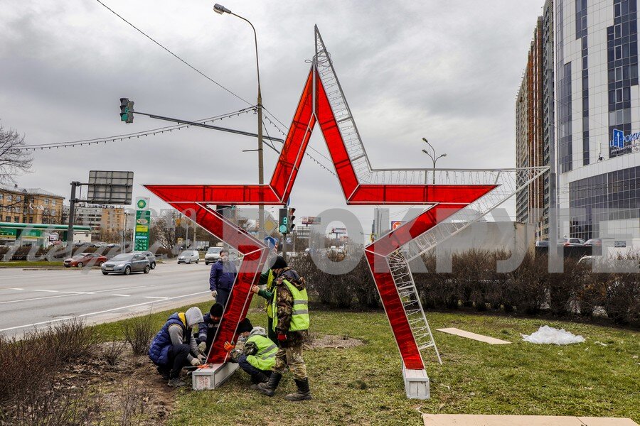 На круговом пересечении Олимпийского проспекта и улицы Каргина устанавливают красные звезды. В преддверии 75-летнего юбилея Великой Победы город украсят 14 арт-объектов. Праздничное оформление делают по заказу МКУ «Леспаркхоз», которое запланировало установить такие звезды на улице Щербакова (2), Олимпийском проспекте (4), улице Мира (8). На бульваре Ветеранов появится арка «Самолет», а на входах в городской парк – арки «Звезды»: одна – на улице Мира, а вторая – на улице Колпакова.