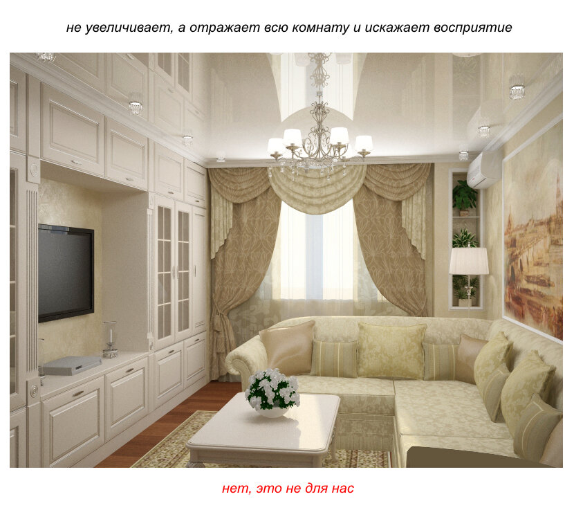 В общем! Мы, дизайнеры, не любим глянцевые потолки и вам не советуем. Если вы сделали такой потолок и вам нравится, ок, это ваш выбор, мы его не осуждаем. Но если вы ещё думаете делать или нет, то лучше нет, чем да.