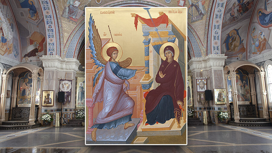 В галилейский город Назарет, в дом Иосифа, ко Св. Деве Марии, в шестой месяц по зачатии Иоанна Крестителя, послан был Архангел Гавриил возвестить Ей тайну воплощения от Нее Бога Слова. Радуйся благодатная: Господь с тобою: благословенна ты в женах, — приветствовал ее небесный вестник словами, которые Церковь ныне ежедневно повторяет в молитве: «Богородице Дево, радуйся!»