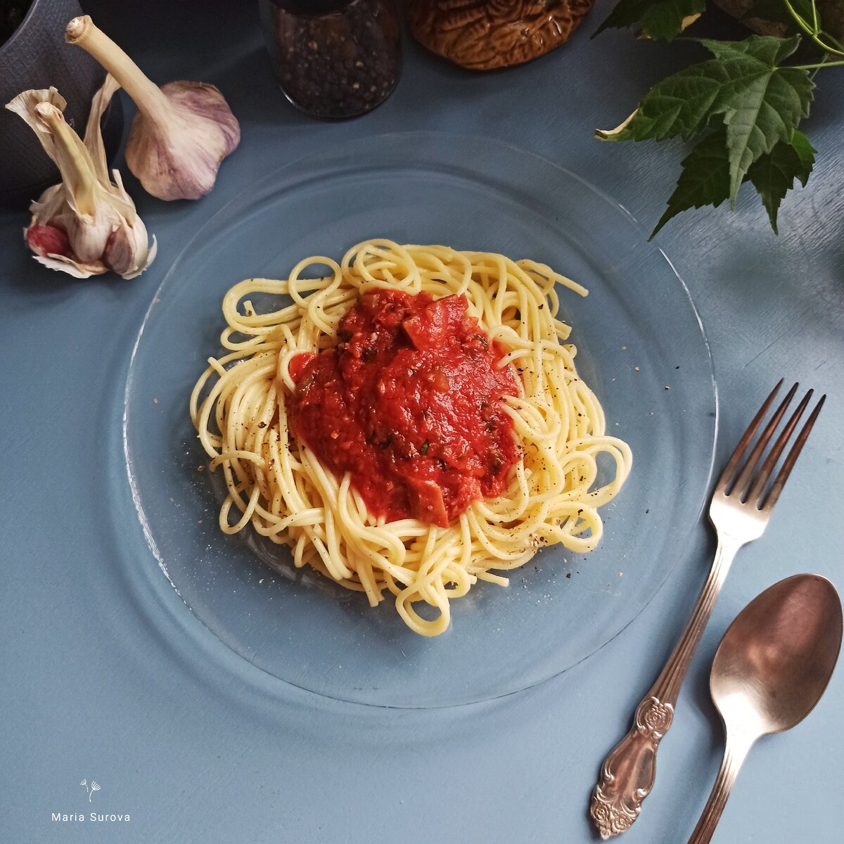 Паста с тунцом и протертыми томатами, одно из наших любимых семейных блюд! Готовится очень быстро, получается вкусно и сытно! Ещё одно преимущество этого блюда, что все основные компоненты хранятся долго. Когда в магазине акция на тунца в банке, протёртые томаты или помидоры в собственном соку, оливковое масло и хорошие макароны – берём побольше. Для соуса нужны именно протёртые томаты, кусочками или целые в собственном соку – но не томатная паста! Ингредиенты: На 5 порций Приготовление: Поставить в большой кастрюле 3 литра воды на огонь. Когда закипит, бросить чайную ложку соли и спагетти. Когда они станут мягкими и опустятся в кастрюлю, перемешать и оставить варить на среднем огне. Время варки обычно указано на пачке. Это время до готовности аль денте (на зубок), если хотите отварить полностью, варите дольше на пару минут. Пока варится пачка спагетти, обычно это 10-11 минут, я готовлю соус. Чищу и измельчаю чеснок. Я рублю ножом, но можно воспользоваться чеснокодавилкой или мелк