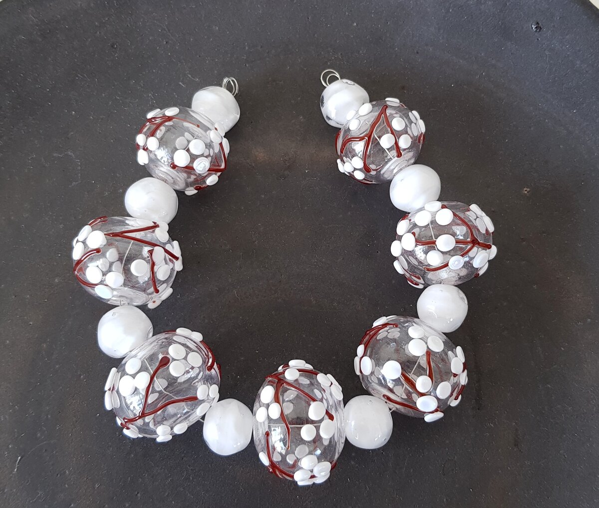 Этот комплект бусин я делаю достаточно редко - нужно особое вдохновение и предельная концентрация. Просто так взять и повторить его сложно, плавали-знаем. Струкрура бусин такова: основа из прозрачного стекла, на нее вплавлены веточки с ягодами, тоже из стекла. Чтобы сделать такой набор, я подбираю три стекла: прозрачное, коричневое и белое. Включаю горелку (как у ювелира, только больше), разогреваю стекло, плавлю основу для бусины. Из цветных нагретых стекол вытягиваю струны, ими рисую в огне по основе - ветки, точки-ягодки. После готовые бусины отправляются в печь на обжиг. Потом их ждет чистка и мойка в воде, высыхание - и комплект готов! Из такого комплекта можно сделать колье на 5 бусин и сережки:) К счастью, я могу работать из дома и никуда не выходить, делая бусины. Это очень актуально на самоизоляции. Другие мои работы из стекла можно увидеть в инстаграме: https://www.instagram.com/veretelnik_natalia/
