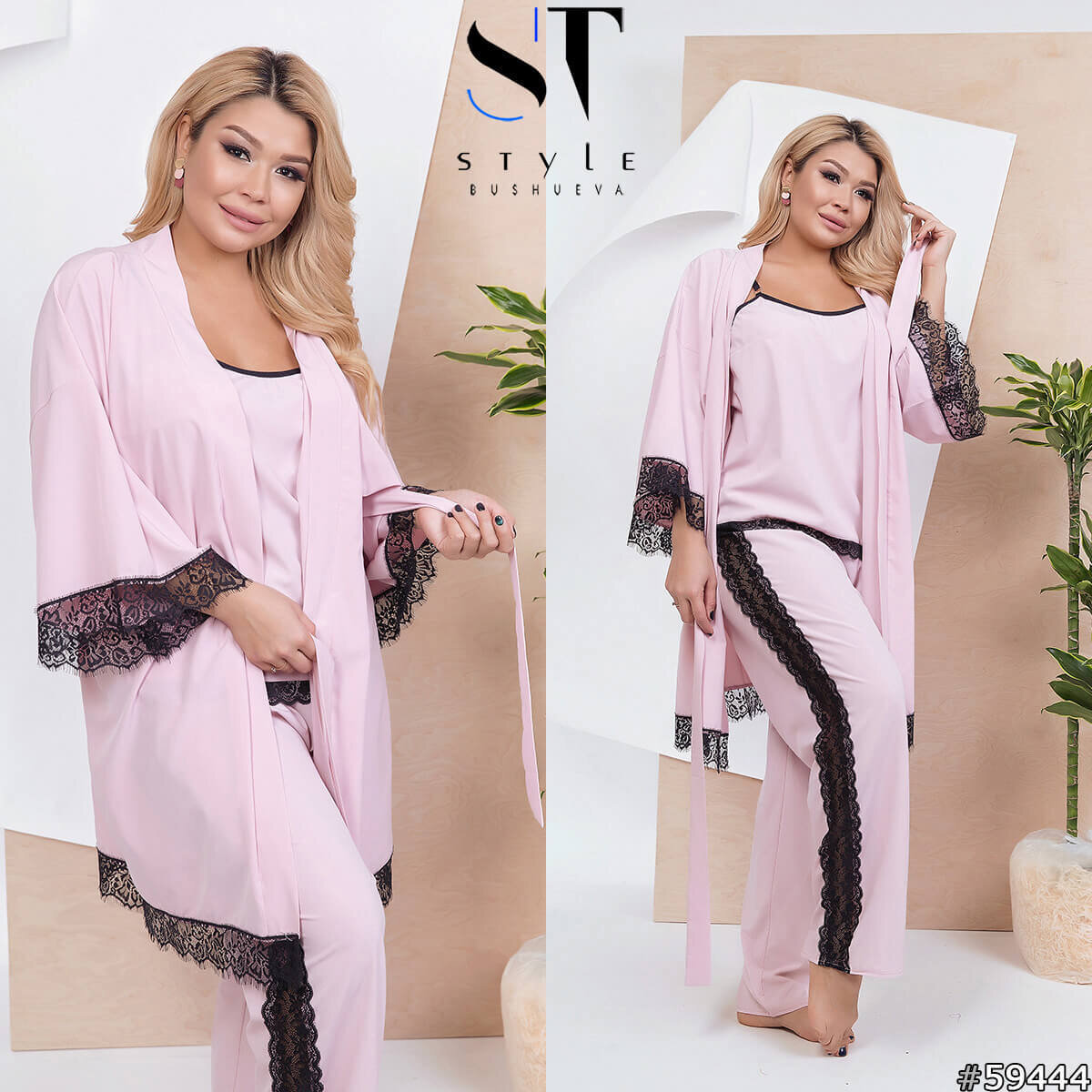 Модный и уютный комплект для сна в размерах с 50 по 64.Комплект состоит из майки,брюк и халата. Майка на регулируемых бретелях,свободного кроя, с круглым вырезом, обрамленным черным кружевом, что сочетается с кружевом внизу. Брюки по бокам кружевные лампасы,свободного кроя. Халатик с рукавами три четверти, завязывается на запах с помощью пояса. Халат также украшен черным кружевом, как и майка с брюками. Комплект для домашнего отдыха и сна ,состоящий из сорочки и халатика. Сочетание мягкой ткани и кружевной отделки создает прекрасный домашний образ. Ночная сорочка на тонких бретелях и короткого халатика на запах, рукав три четверти. Комплект из бархата,состоящий из топа,брюк и укороченного халатика в размерах с 50 по 64.В комплект входит из удобного халатик,завязывается поясом на запах, и кружевного топа и свободных брюк. Рукава халата украшены гипюром, такие вставки есть по бокам брюк. Прекрасный комплект для приятного домашнего отдыха и сна. Модный спальный комплект позвол