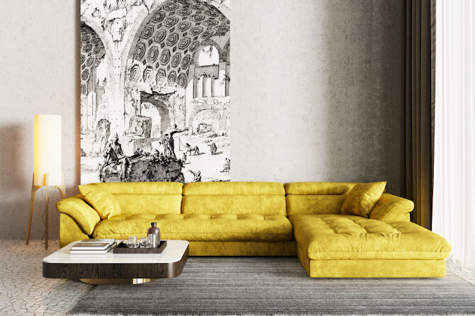 Дизайнерский офис Vosart хочет провести текущий год под ярким летним солнцем. Главным мебельным атрибутом компании стал угловой диван сочного желтого оттенка. Модель оснащена двумя подлокотниками, которые свободно можно регулировать, и комфортными подушками. В качестве обивочной ткани был использован бархат, кстати, обладающий гипоаллергенной функцией. Специалисты Vosart отмечают, что диван не только станет прекрасным дополнением в гостиной, но и может послужить разделительным элементом между столовой и салоном. Естественно, здесь речь идет о студии. Дизайнеры Тина Грин и Пьетро Мингарелли видят интерьер этого года со