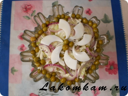 Салат «Гулистан». Ингредиенты: 100 грамм капусты белокочанной; 100 грамм репчатого лука; 100 грамм зелёного горошка; 80 грамм майонеза; 2 варёных яйца; соль и специи по вкусу.