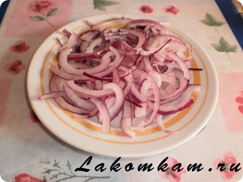 Салат «Гулистан». Приготовление. Репчатый лук нарезаем полукольцами.