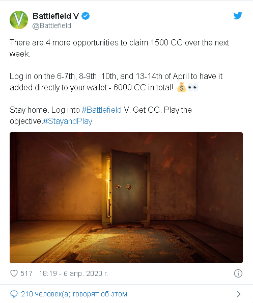 Разработчик DICE расширяет свое предложение бесплатной валюты для Battlefield V, теперь позволяя вам получить 6000 корпоративных монет для легкого входа в игру на следующей неделе. Любой, кто войдет 6-7, 8-9 и 10 апреля, а также 13-14 апреля, получит 1500 монет . Вы можете получить 1500 за каждый день / период на общую сумму 6000. DICE распределяет валюту микротранзакций в рамках глобальной кампании «Останься и играй», которая призывает людей оставаться дома и играть в видеоигры, чтобы помочь сгладить происходящее в мире с COVID-19. Ранее DICE раздавал свободную валюту Battlefield V в апреле, а теперь компания значительно расширяет это предложение. Компания Coin является основной валютой в игре для Battlefield V, которую игроки могут тратить на различные "апгрейды", поэтому это приятный бонус, которым может насладиться каждый.