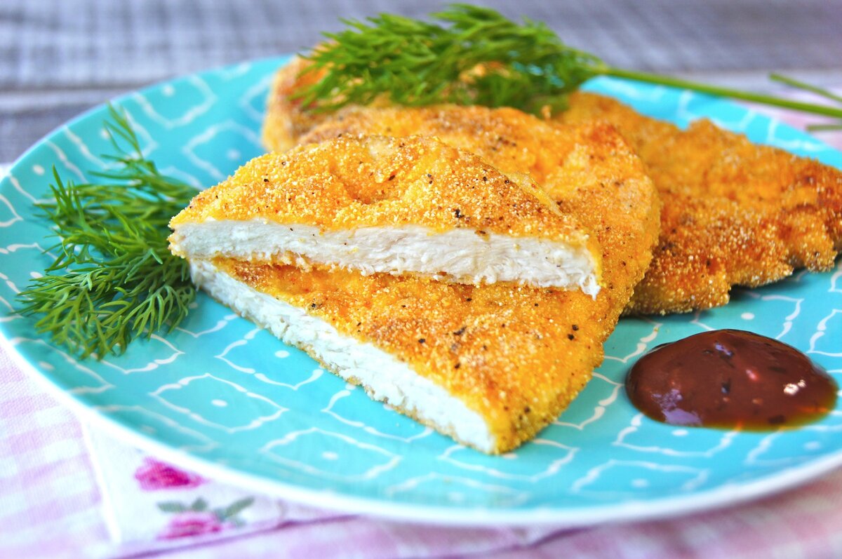 Совет! Если вы придерживаетесь правильного питания или по какой-то причине вам нельзя есть жареное в масле, выложите филе грудки в панировке на противень застеленный пергаментом, поставьте в разогретую до 190 градусов духовку минут 30-35.