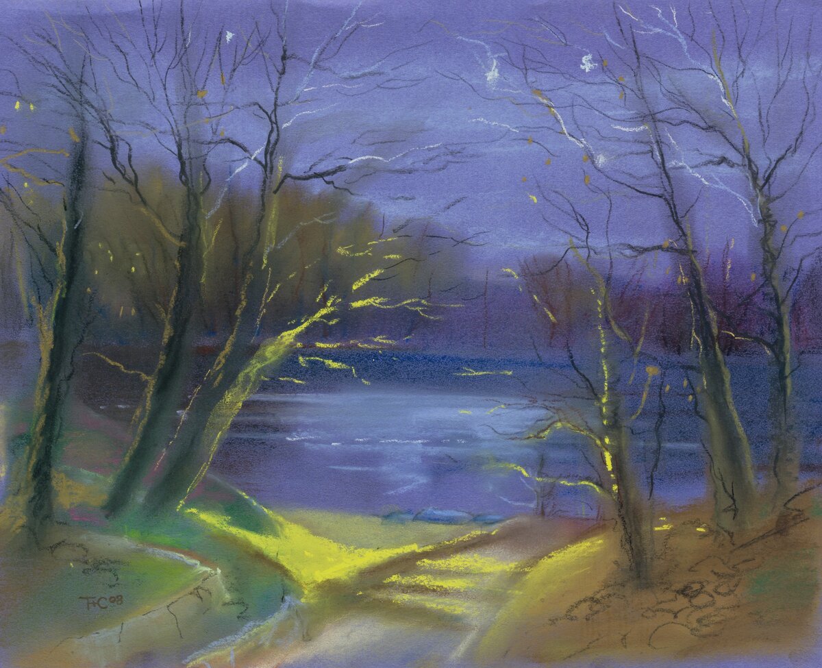 Я немножко лукавлю, озеро-то одно - Пурхма, а вот картин – три, сделанных в разные годы с разным настроением. Самая старая- ночная зимняя. Это была, кажется, первая поездка в «Ильдорф», пансионат недалеко от Ильиногорска в Нижегородской области. Выход поздно вечером на прогулку, знакомство с окрестностями. Мы увидели в темноте очертания озера, темные лесные чащи вокруг, и, главное, очень яркие, даже слегка пугающие лимонные лучи света, которые образовывали свой узор и, казалось, имели особый смысл. Конечно, это так причудливо выглядел свет фонарей на берегу озера, на прогулочной дорожке и у горки. А эмоций вызвал достаточно, чтобы захотелось нарисовать этот сюжет. Вторая работа побольше, осенняя. Мы уже были хорошо знакомы со здешними местами, как и многие нижегородцы, владимировцы и москвичи. По берегам Пурхмы растет крепкий, здоровый лес, преимущественно хвойный, есть и дубы, и липы. В пансионате к воде ведет удобный спуск, который зимой превращается в горку. Эта картина появ
