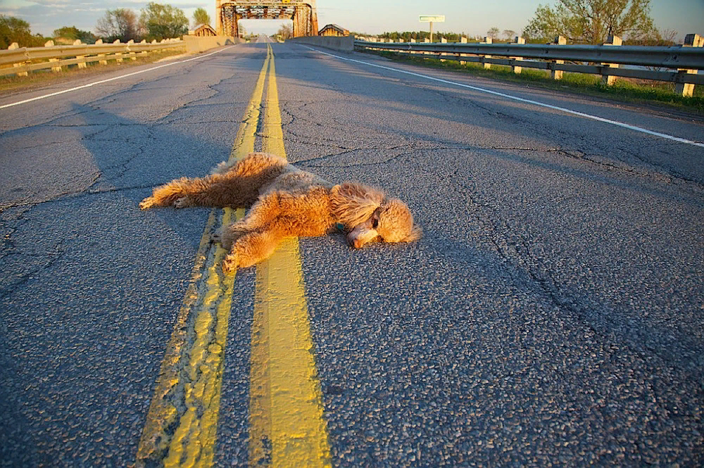На перекрестке трех дорог лежал огромный рыжий дог. Он голову на лапы положил, как-будто он устал и изнемог. Водители сигналили ему сбавляя скорость проезжая мимо, а дог лежал всё так-же неподвижно. А дог был мертв, темнела кров под ним. И рядом у дороги сидел мальчишка на пеньке с поводком в руке. Горюя что дружка не уберег был так-же неподвижен как и дог...