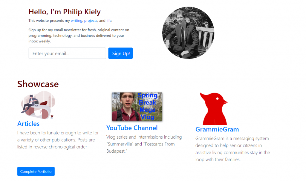 Если вы веб-разработчик, то к сайту предъявляются особые требования. Конечно же, лучше всего, чтобы сайт был написан лично вами. Например, веб-разработчик Philip Kiely так показывает свое мастерство. Внизу сайта он пишет используемые технологии: «Built with Pelican, Bootstrap, Font Awesome, and Google Fonts».