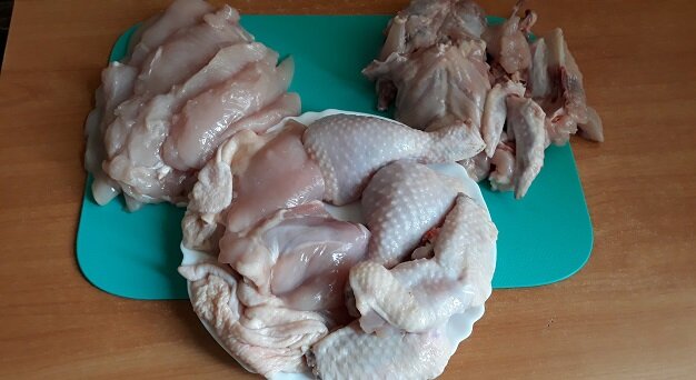 Купила курицу, помыла и начала разделять ее на несколько частей. В каждую из трех тарелок складывала определенные части мяса. Первая тарелка была для приготовления первого блюда, сегодня был суп.