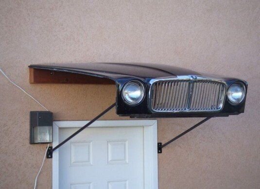 Козырек над дверью из капота автомобиля Если у вас есть в гараже ненужный капот от Жигулей или другого крутого автомобиля, а денег на козырек для входной двери нет, то можете поступить, как автор представленной на фото самоделки.