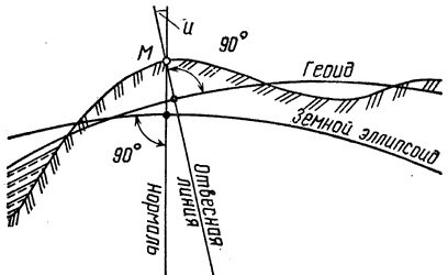 Географические координаты (широта и долгота) точек на земной поверхности, определенные по результатам наблюдений небесных светил, называются астрономиическими координатами, а по результатам геодезических измерений на местности – геодезическими координатами. При определении астрономиических координат точка проектируется отвесной линией на поверхность геоида, а при определении геодезических координат – нормалью на поверхность земного эллипсоида. Вследствие неравномерного распределения массы Земли и отклонения поверхности геоида от поверхности земного эллипсоида отвесная линия в общем случае не совпадает с нормалью, что и показано на рисунке. Таким образом, географические координаты – обобщенное понятие об астрономических и геодезических координатах, когда уклонение отвесной линии не учитывается.