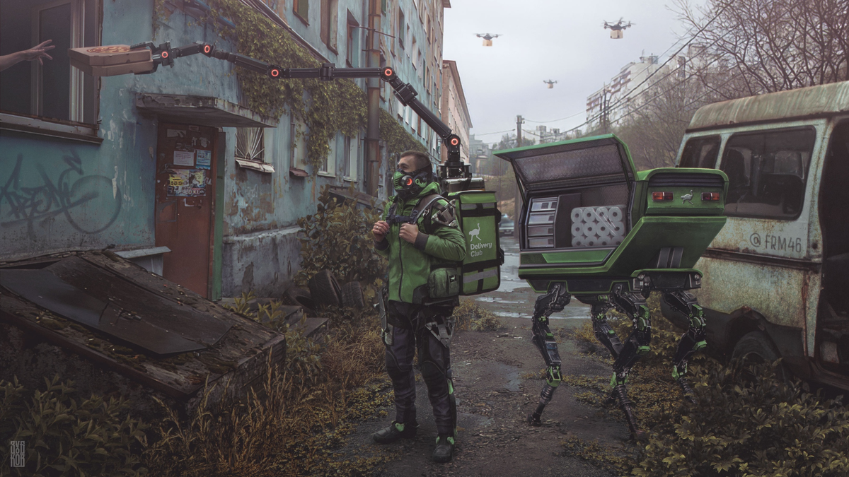 Все человечество вынуждено оставаться в убежищах. Выходить на улицу запрещено. Планета разбита на опасные и безопасные зоны. Единственный способ не умереть от голода - доставка всего необходимого универсальными курьерами. Большинство рабочих мест заняли роботы. Повара, рабочие на заводах, фабриках - роботы. Но они не могут покинуть безопасные зоны, т.к. на них губительно действует окружающая среда. Единственный вариант доставки всего необходимого - курьеры. Раз в 10 минут необходимо дезинфизировать открытые участки кожи. Бывает такое, что в самый неподходящий момент заканчивается жидкость для дезинфекции и человека начинают покрывать опухоли и язвы. Не всегда удается добраться до безопасной зоны или до локального пункта с автоматом дезинфекции. Как думаешь, долго ли протянет человечество при таких условиях? Есть ли смысл в продолжении такой жизни? Какие видишь варианты выхода из такой ситуации? Арт контент взят у художника: Zubkov