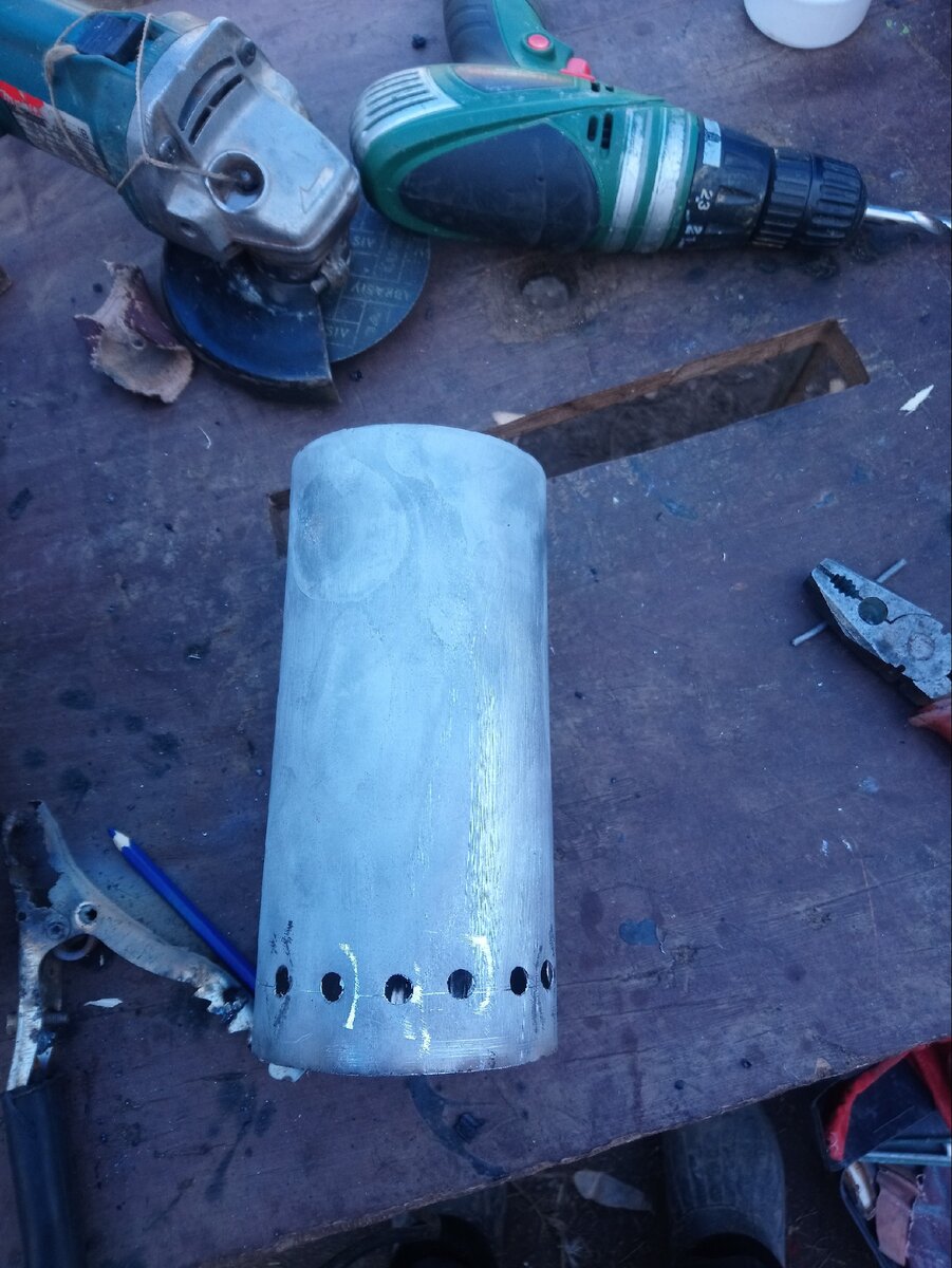 Всем привет!. Сделал мини гриль, сделай мини стартер. Был кусок водосточной трубы 100мм Крашеной в белый цвет, так ещё и оцинкованный, краску и цинк обжег горелкой. Сделал отверстия 9мм для тяги. Кусок трубы 200мм. Изготовил колосник из электродов 4мм. Закрепил колосник следующим образом: пропустил 2 электрода, и приварил к ним колосник. Лишние концы отпилил Ручку сделал из электрода, приварил к концам болты м4, просверлил отверстия на месте шва трубы (самое толстое место, 3 слоя металла) Ручка временная, потом сделаю из дерева, наклепаю 2 половинки. Это будет защита от жара, размечаю лист оцинковки 0.7мм. Думая над креплением защиты пришёл к решению припять её к ручке. Таким образом согнул крепление и припаял (не смог сделать фото) паял припоем офлюсованым 30% серебра. Теперь осталось протестить. P.s. Сосиски купил, хотим сделать хот доги. Спасибо за внимание! Всё фото из личного архива.