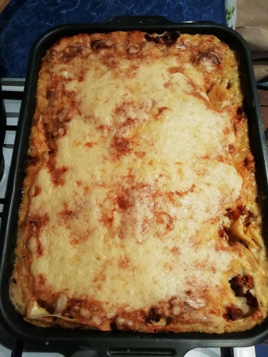 Вам понадобится: - фарш (говядина + свинина) 1 кг; - листы лазаньи 9 шт.; - краснодарский соус/соус болоньезе/пассата 1 банка/пачка; - морковь 1 шт.; - лук 1 шт.; - чеснок 3-4 зубчика; - соль, перец по вкусу; - сыр твердый 300-400 гр.; - соус бешамель (см. рецепт здесь) Мелко режем лук, зубчики чеснока пропускаем через пресс, морковь натираем на крупной терке. Слегка обжариваем лук и чеснок, добавляем морковь, еще немного обжариваем. Добавляем фарш, солим, перчим. Тушим 15-20 минут, затем добавляем томатный соус (пасту), и тушим еще 5 минут. Сыр натираем на крупной терке. Смазываем дно формы небольшим количеством соуса бешамель (см. рецепт здесь). Затем выкладываем 3 листа лазаньи (при необходимости предварительно отварить (см. инструкцию на упаковке)). Сверху на листы выкладываем фарш, затем соус бешамель, затем сыр. Выкладываем сверху еще 3 листа лазаньи. Повторяем все слои и снова кладем 3 листа лазаньи. Сверху поливаем остатками соуса бешамель и посыпаем тертым сыром. Ставим в ду