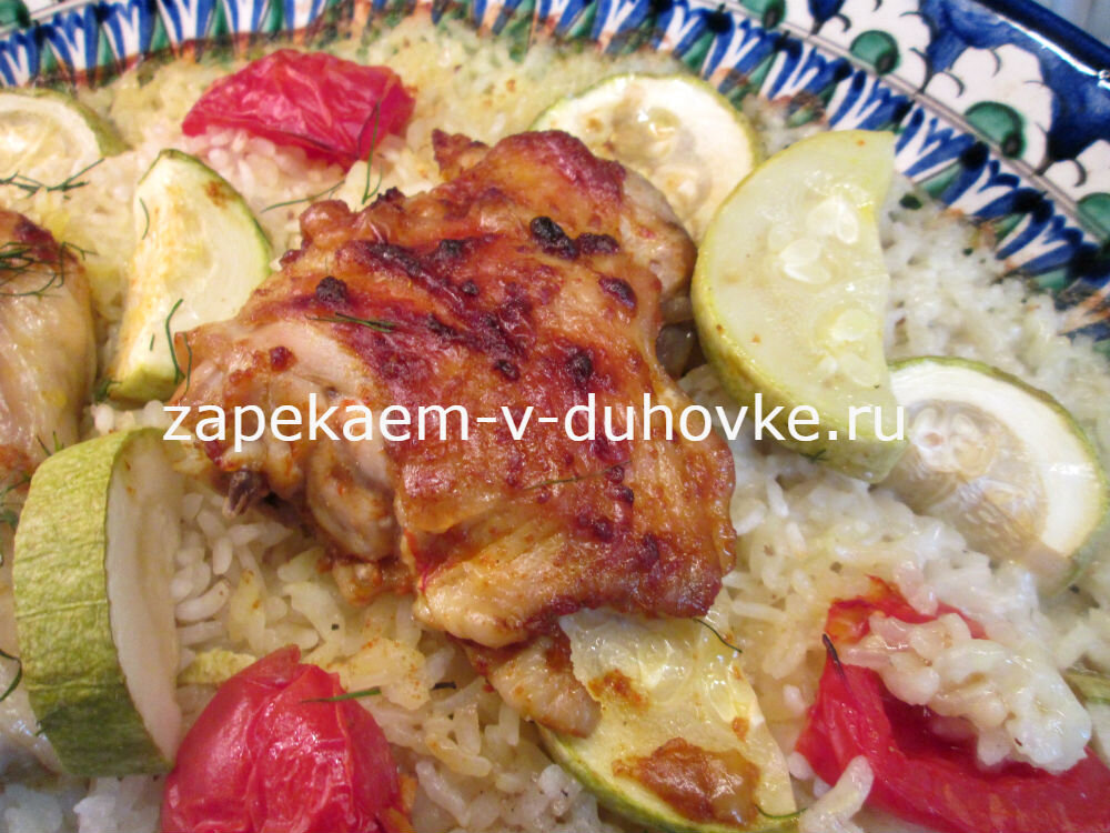 Курица с рисом и овощами с восточным колоритом, запеченная вв духовке