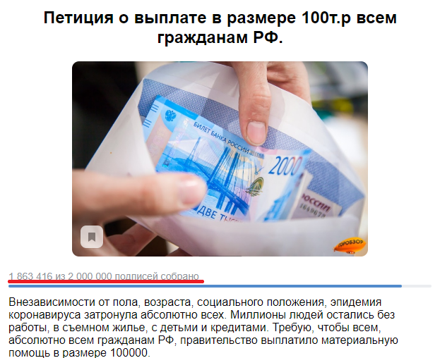 Эта статья как крик души. Как же меня раздражает тупость людей. Вот вам конкретный пример, в котором люди подписывают псевдо петицию о том чтобы всем гражданам РФ выдали по 100т.р из-за безработицы ! И глупые зеваки ставят свои якобы подпись на согласие с реализацией петиции... Это лишь пример в контакте, но есть и другие сайты, которые зарабатывают миллионы подписей. Первое что нужно уяснить - куда идет эта статистика подписей с сайте ? Ответ : НИКУДА. Чтобы подписать какую либо реальную петицию вам как минимум придется расписываться лично, оставлять адрес и паспортные данные. Не просят этого сделать на таких сайтах потому - что так они не соберут никакого ажиотажа и люди просто пройдут мимо , а тут нужно всего лишь пару раз кликнуть мышкой и ждать великих перемен ! Такие сайты и петиции приносят пользу только лишь владельцу самого сайта, поскольку собрав интерес народа можно впихнуть рекламку за которую отвалят хорошую сумму. Как всем известно собрать огромное кол-во зевак на любо
