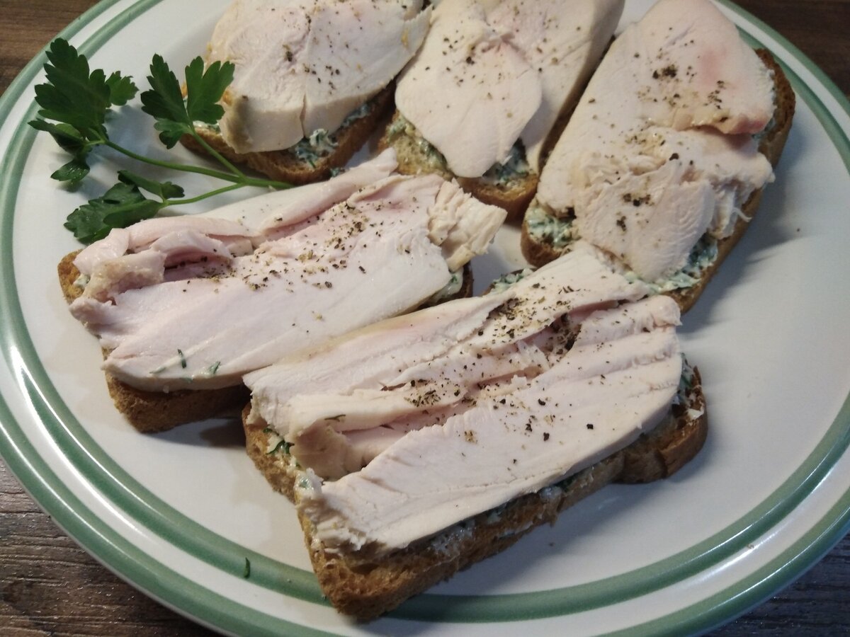 Кто сказал, что бутерброды нельзя считать здоровой едой? А если с отварной куриной грудкой, на тосте с укропным маслом и самое главное - с утра, когда позволительно есть все, что заблагорассудится? По мне так вполне здоровая «всухомятка». И притом вкусно! Впрочем, попробуйте сами! Готовится не хитро. 1.Отварить куриную грудку в слегка подсоленной воде (опускать уже в кипящую воду). 2.Сливочное масло растереть с измельченным укропом, зубчиком тертого чеснока, толикой свежемолотого черного перца и щепоткой соли. 3.Сделать тосты в тостере или на сухой сковороде, намазать их приготовленным маслом, уложить сверху нарезанные поперек волокон ломти отваренной куриной грудки. Сдобрить щепоткой свежемолотого черного перца. Кушайте на здоровье и с удовольствием, приятного аппетита! И добавляйтесь, будем готовить вместе.