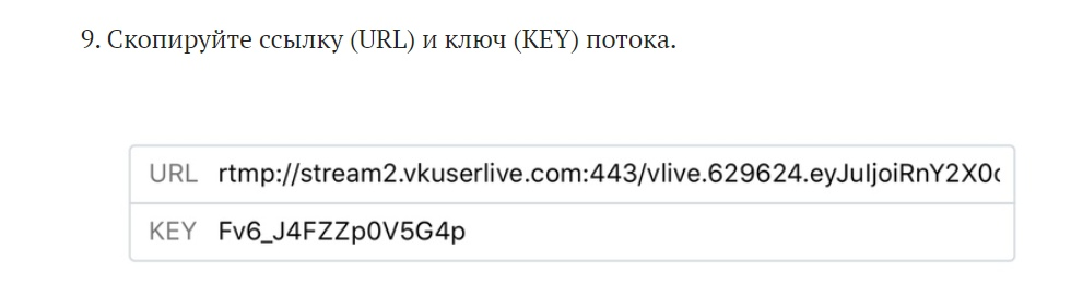 Внимание: ни в коем случае никому не сообщайте Url и Key, их могут использовать злоумышленники для того, чтобы завладеть вашей трансляцией. У меня на картинке код взят из инструкции по настройке трансляции во Вконтакте.