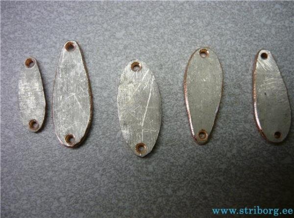 Больших троллинговых колебалок не делал, а до маленьких ультралайтовых руки иногда доходят. Вырезаем заготовки, в данном случае - медь 2 мм. При помощи нехитрого инструмента Выштамповываем внутренний радиус. Получаем такие чешуйки. Переворачиваем, кладём на плоскость и постукивая молотком выравниваем, уменьшая изгиб до желаемого. Если необходимо, делаем наружный изгиб, но так, чтобы сохранилась внутренняя продольная вогнутость. Затем наружную поверхность обрабатываем напильником или бормашиной придавая поверхности желаемую форму уменьшая толщину к краям. Это в данном случае, можно толщину оставлять равномерной. Самодельные колебалки, изготовленные своими руками, для ловли на ультралайт готовы Можно так оставить, можно отполировать. Я не люблю очень блестящие. Тестируем в ванной, Поправляя если надо изгибы молотком, затем чуток подшлифовываем. Оснащаем кольцами, тройниками, отдаём на тест независимым экспертам.