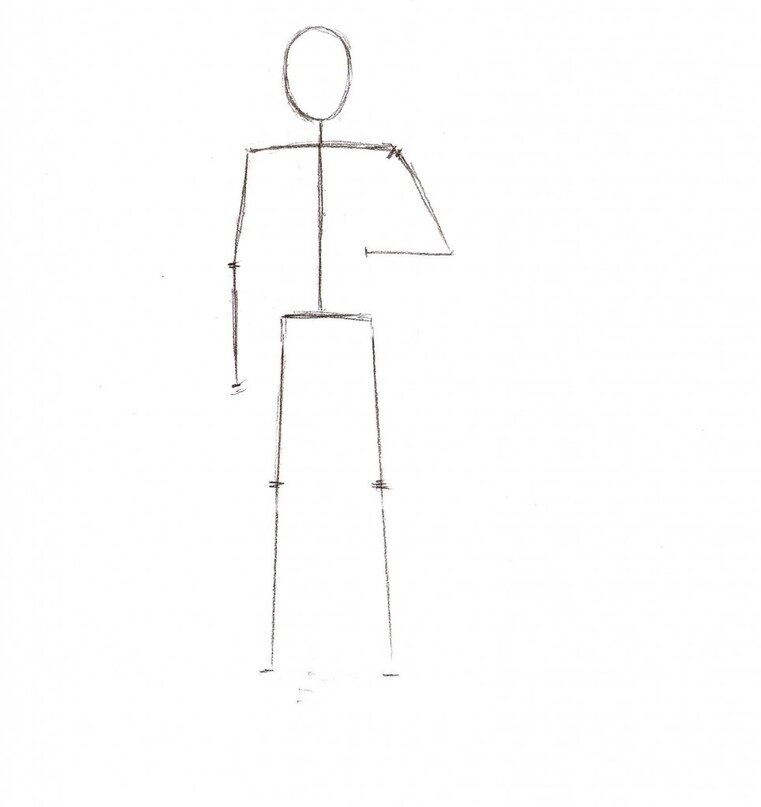 Как нарисовать самурая поэтапно Шаг 1 Статичные позы весьма удобны для изучения пропорций, поэтому стикмена рисовать будет довольно просто. Рост мужчины укладывается примерно в сумму длин семи его голов, из которых три с половиной — четыре приходятся на ноги. Плечи у мужчин намного шире талии(у женщин линии примерно одинакового размера), их ширина равняется сумме ширин примерно трёх голов. Руки, вытянутые по швам, доходят примерно до середины расстояния от пояса до коленного сустава (в этом этапе немного короче, так как стикмены у наших художников не включают в себя кисти рук). Шаг 2 Придадим объём нашему стикмену. Под головой нарисуем шею – короткий цилиндр, на котором надёжно крепится голова, соединим её покатыми линиями с шарами плечевых суставов. Нарисуем руки – условно каждая из них состоит из пяти частей: плечевой сустав, длинное плечо, локтевой сустав, длинное предплечье, кисть. Пользуясь разметкой из предыдущего шага, нарисуем туловище – оно должно слегка сужаться книзу. А во