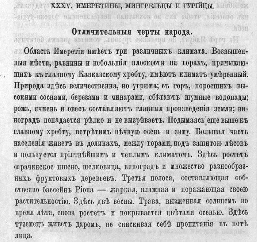 Продолжаю знакомить вас с материалами из Российской империи, которые нахожу в ходе своих личных исследований прошлого... В этой заметке, кратко расскажу о найденных сведениях про часть Грузии, которую называют словом Имеретия. В справочнике "Народы России" 1880 года, природа этого края описана вот так.. Перевожу на современный Русский язык, чтобы было понятнее: "Природа большей части равнины Имеретии очаровательна, а растительность и ещё того больше. Многие места утопают в зелени и цветах, редких даже в оранжереях, а здесь имеющих значение простого хвороста, которым огораживают сады или плетут курятники. Роскошная растительность видна повсюду; слышится запах азалей и миндаля; плющ и боярышник выглядывают из-за зелени. С наступлением ночи, картина принимает ещё более фантастически-очаровательный вид, когда весь лес наполняется маленькими, порхающими вокруг огоньками. Большое количество летающих мушек с фосфорическими, светящимися желудками, как-будто лампадки, наполняют весь воз