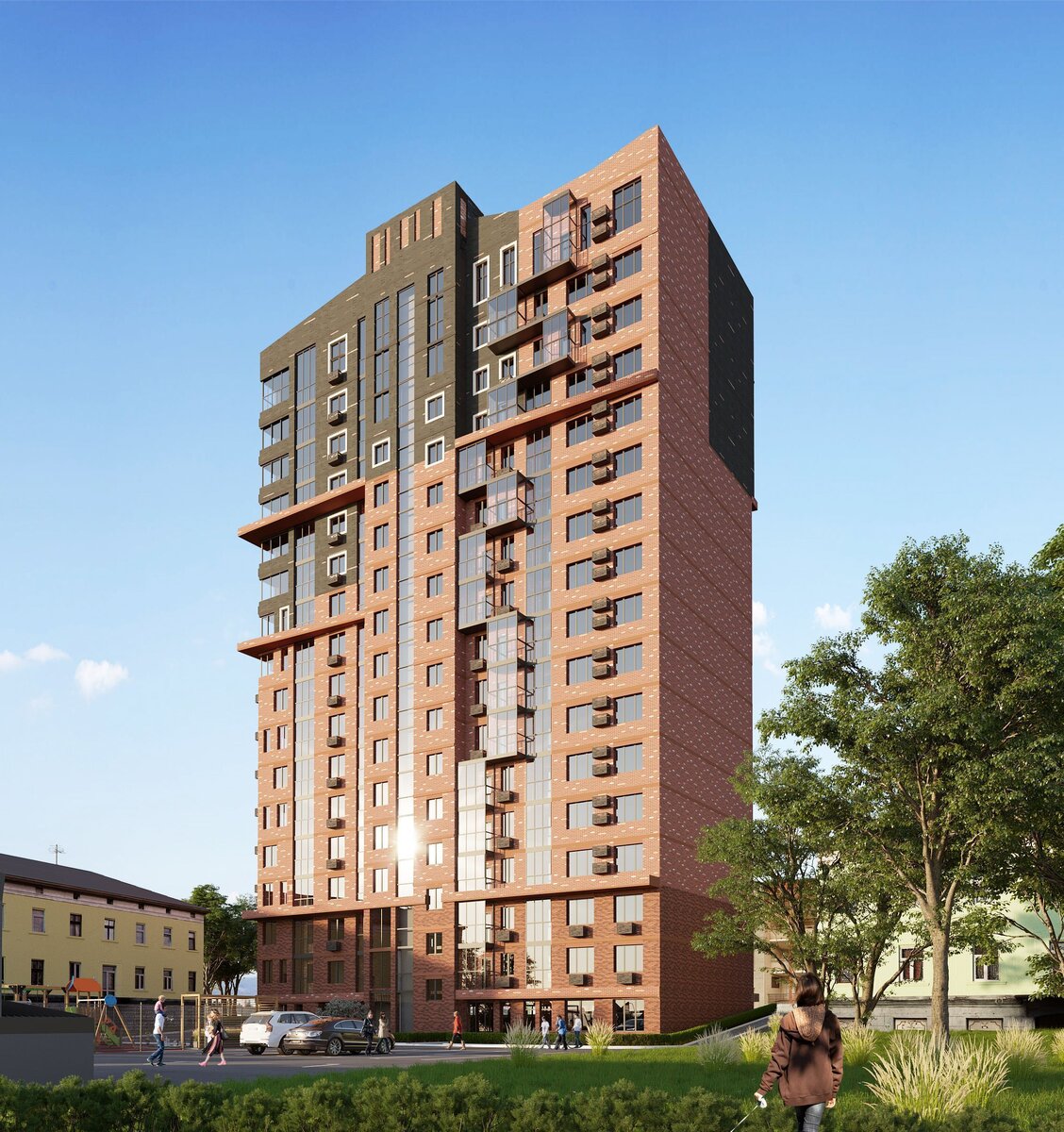 Плюсы: стильный дом недалеко от центра города, с разнообразными планировками, современным благоустройством