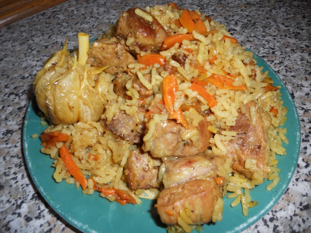 Данный рецепт предполагает использование следующих продуктов: Как приготовить: Хорошо промыть мясо и порезать его на средние кусочки. Лук и морковь почистить. Луковицы порезать в виде полуколец, а морковь в виде соломки. Разогреть казанок, добавить растительное масло и выложить нарезанный лук. Обжарить лук до появления золотистого оттенка, постоянно его помешивая. Затем добавить свинину и все жарить до того момента, пока не образуется зажаренная корочка, примерно 10 минут. После этого добавить морковь. Все хорошо обжарить в течение 3-5 минут, постоянно помешивая. Обжаренные овощи с мясом залить о кипятком, добавить соль и приправы для плова по вкусу. Тушить под крышкой на умеренном огне еще 20 минут. Рис промыть, а затем выложить на овощи с мясом ровным слоем, в серединку положить головку чеснока. Добавить воды в таком количестве, чтобы она покрыла рис на 1 палец. Накрыть крышкой, довести до кипения и тушить на среднем огне 10-15 минут, пока вода полностью не испарится. Ко