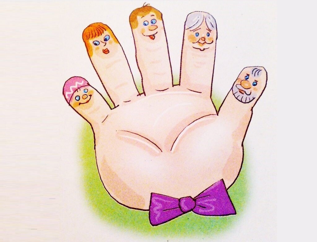 А вот и вся семья. Поочередно пригибать пальчики к ладошке, начиная с большого, а со слов «А вот и вся семья» вт