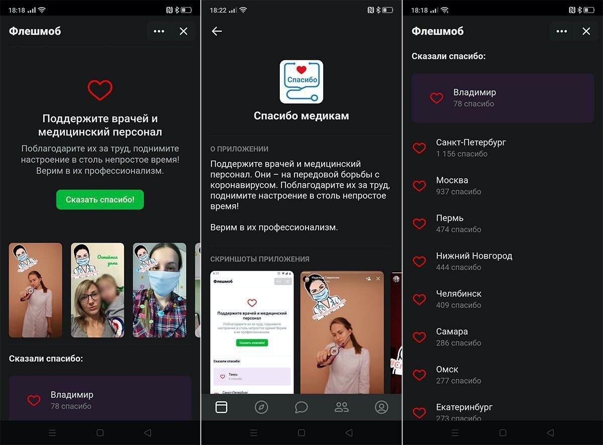 Чтобы выразить благодарность всем, кто сейчас борется с коронавирусом, достаточно просто опубликовать историю со стикером #спасибомедикам, ну а счетчик приложения зафиксирует, сколько благодарностей и из какого города ушло участникам «ковидной войны».