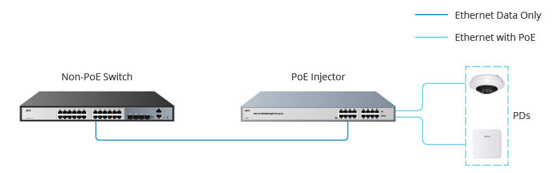 Когда Ethernet коммутаторы или другие устройства не имеют функции PoE, но нуждаются в поддержке PD (Питаемое Устройство), таких как IP камеры PoE, точки беспроводного доступа PoE и т. Д., PoE инжектор может помочь передавать как мощность, так и данные на эти PD до 100 метров. Обычно PoE инжектор преобразует переменный ток в постоянный ток, поэтому он может быть источником питания для низковольтных устройств PoE.