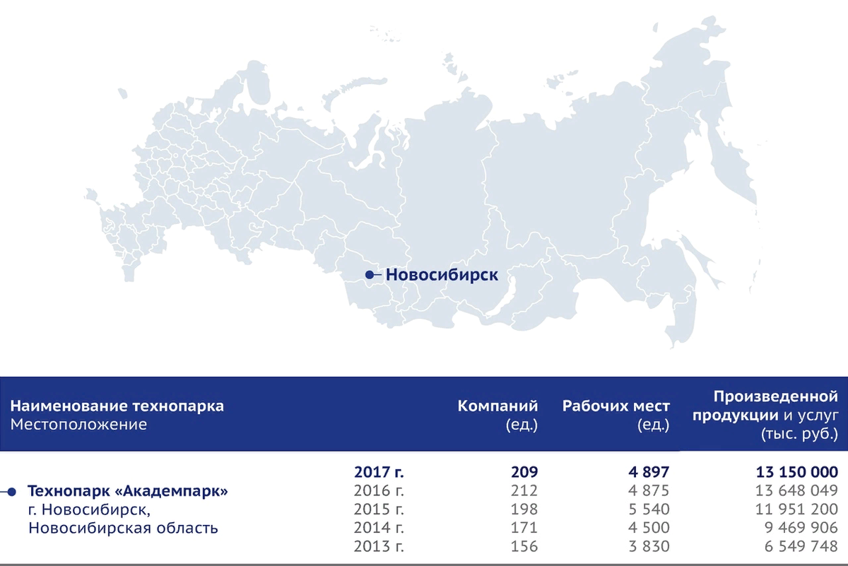 И если верить статистике, предоставляемой сайтом Академпарка, то согласно ключевым показателям эффективности деятельности на 2019 год, он попал в 1 группу рейтинга: «Наивысший уровень эффективности функционирования технопарка» с выручкой его резидентов в 28 миллиардов рублей.