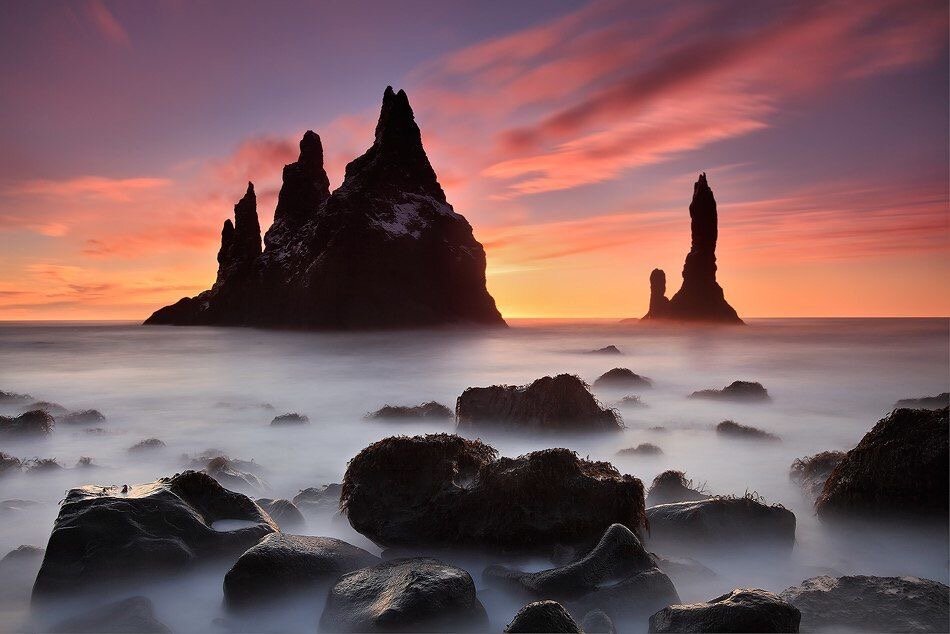 Давным-давно два огромных тролля тащили через пролив под горой Рейнисфьяль большой корабль. Не смогли гиганты дотащить свой фрегат до берега вовремя, не рассчитали силы, солнце взошло и вмиг превратило и троллей, и парусник в огромные базальтовые скалы – пугающие и вызывающие восторг одновременно. Так они и стоят уже не один век, возвышаясь над уровнем воды на 60 метров. Впрочем, местные жители утверждают, что ночью тролли оживают и двигаются, в результате иногда кажется, что базальтовые столбы изменили свое положение. Так гласит старинная исландская легенда. С тех давних пор маленькая деревенька Вик в Южной Исландии, манит к себе путешественников, чтобы волшебство, рассыпаясь брызгами морского прибоя, нашептывало мифы древней страны и манило узнавать историю этой загадочной земли все лучше и лучше. Скалы Рейнисдрангар – место, не только удивительной красоты, но и место, которое потрясает воображение. Черный пляж с вулканическим песком, бескрайнее море, зловещие, даже жуткие скалы вдал
