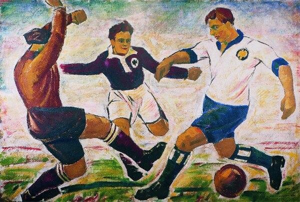 Русский художник-эмигрант Николай Загреков в 1930 году написал картину о немецком футболе. Чему она посвящена, вы сейчас узнаете. Называется она «Герта атакует. С мячом – Ганне». Николай Загреков написал это произведение в стиле «Новая вещественность» в 1930 году. Сам он почти всю свою жизнь прожил в Германии, куда переехал после революции. В межвоенные годы Николай создал несколько картин на спортивную тему. Например, «Метатель копья на Олимпийских играх» и «Метательница ядра». Но «Герта атакует» – самая известная из этой серии. Берлинец Загреков был свидетелем подъема столичного футбола в начале 1930-х годов. Он, как и тысячи других болельщиков, восторгался игрой полузащитника Йоханнеса Зобека по прозвищу Ганне. С этим именем связаны первые большие успехи «Герты» – золото чемпионата Германии 1930-го 1931-го (с тех пор команда ни разу не выигрывала национальное первенство). Зобек и Загреков были знакомы. Футболист сам позировал для этой картины. И Загреков, и Зобек пострадали от поли