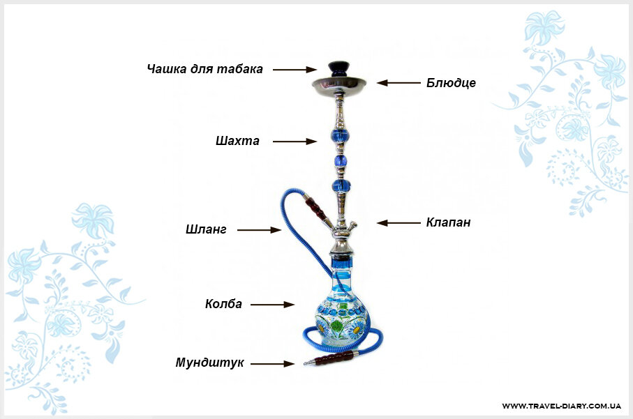 Кальян - это прибор для покура табака. В отличии от сигарет, в кальяне происходит не горение табака, а его нагрев курительной смеси. Кальян позволяет фильтровать и охлаждать вдыхаемый дым. Роль фильтра играет шахта кальяна, на холодных стенках которой конденсируются различные примеси, и сосуд с жидкостью, в которой осаждаются до 38 % содержащихся в дыме веществ. В сосуд вставлена курительная чашка (чилим), соединённая с трубкой (шахтой), конец которой уходит под воду. Выше уровня воды из сосуда отходит ещё одна трубка, через которую производится вдыхание дыма. При курении в сосуде кальяна создаётся разрежение, благодаря чему дым поднимается сквозь жидкость и через трубку с чубуком попадает в лёгкие курильщика. Курительная смесь состоит в основно из табака пропитанного пищевым глицерином, ароматизаторами и глюкозным сиропом.