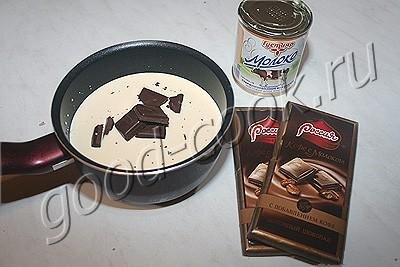В небольшую кастрюльку вылить концентрированное молоко, положить поломанный шоколад и насыпать сахар. При желании для дополнительного аромата можно положить 1 чайную ложку растворимого кофе.