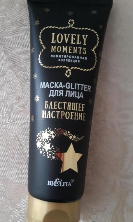 Новый тренд "Блестящее настроение" испытала на себе! Вот и я поддалась новой рекламе и решила попробовать на себе "блестящую" маску от белорусского производителя. В ней многое меня удивило о чём я спешу поделиться с вами... "Lovely moments" Маска-глиттер для лица меня удивила красивой упаковкой, на которой слова выгравированы оригинальным золотым узором. Приобретала я этот тюбик в Гомельском магазине белорусской косметики недалеко от рынка за 3 бел.руб (130 рос.руб.). Производитель нам обещал увлажнение кожи, ее сияние и хорошеехорошее настроение. Так давайте разберемся, что маска действительно выполняет? Плюсы: 1. Горлышко тюбика было закрыто фольгой, что свидетельствовало о его заводскомзаводском закрытиизакрытии +; 2. Маска имеет приятный аромат жвачки +; 3. Имеет эстетичный вид, так как содержит золотые блёстки +; 4. Объем бутылочки составляет 75мл, его хватает на 3 месяца +; 5. Можно сделать красивое селфи+. Теперь давайте перейдем к минусам: 1. Очень плохо смывается с ко