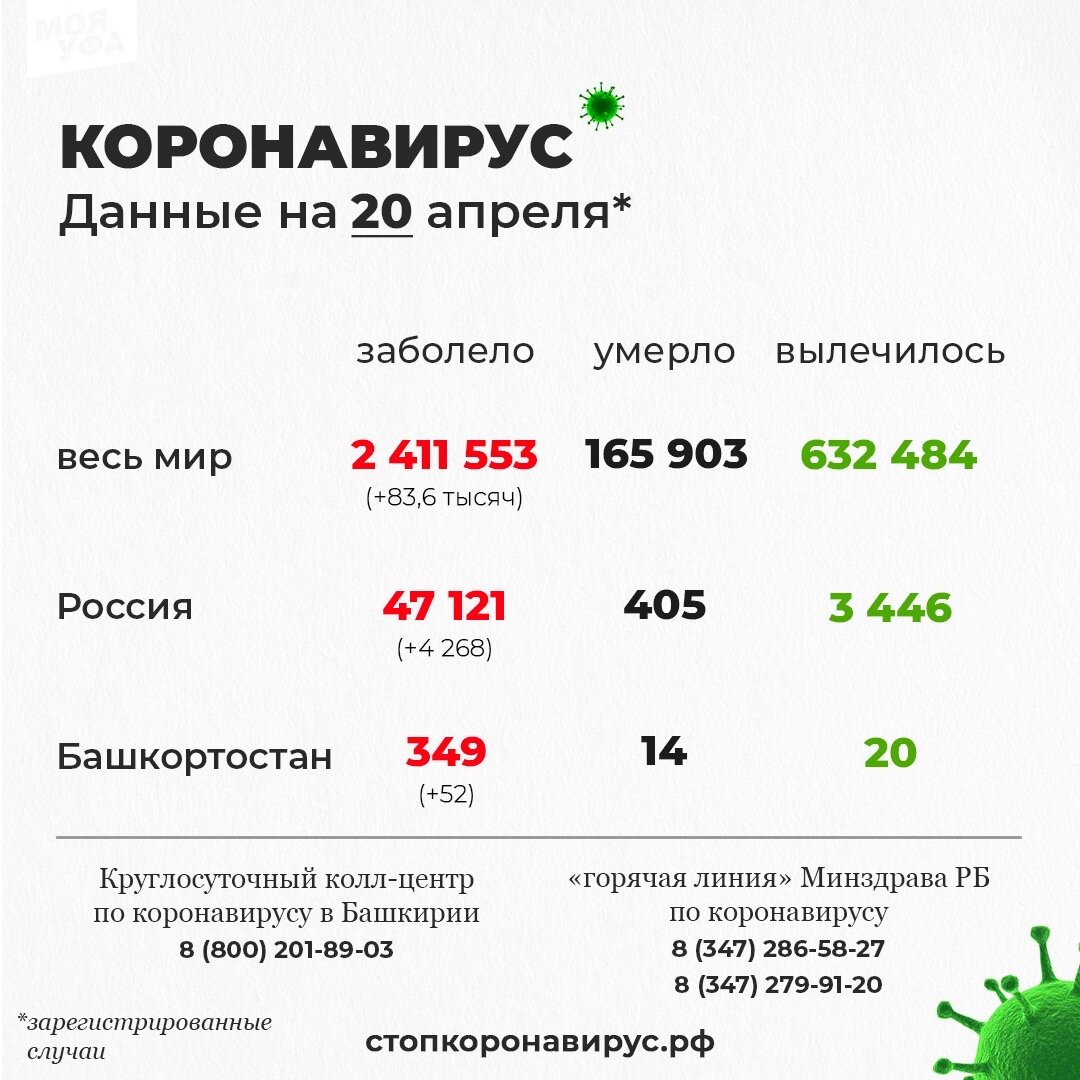 Сегодня, 20 апреля, — 130-й день с момента обнаружения коронавируса и 40-й — с объявления пандемии. На сегодняшний день известно о 2 388 848 заболевших коронавирусом в мире (+19 368). Выздоровели уже 615 459 человек (+3 294), скончались 164 376 (+1 219). На первом месте по числу зараженных по-прежнему остаются США — в стране зарегистрировано 755 162 инфицированных (+13 932 за день) и 40 109 погибших (+1006). На втором месте находится Испания, где зафиксировано 195 944 случаев заражения (+0) и 20 639 смертей. Замыкает тройку стран с наибольшим количеством зараженных Италия, там выявлено 178 972 зараженных (+0) и 23 660 погибших (+0). URA.RU продолжает обсуждать коронавирус и его последствия с экспертами в соцсетях. Уже сегодня, 20 апреля, пройдет стрим в Instagram с адвокатом Павлом Бабиковым. Эксперт объяснит, как вернуть деньгиза несостоявшуюся из-за коронавируса поездку. Завтра, 21 апреля, в 11:00 в Instagram состоится прямой эфир с главой Перми Дмитрием Самойловым. Глава города расс