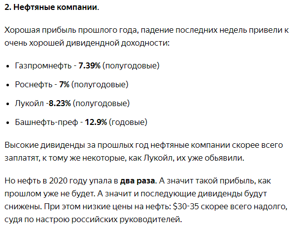 При резком падении на фондовом рынке во время кризиса многие инвесторы начинают покупать акции, руководствуясь следующими соображениями: Неопытным инвесторам кажется: "Ну пусть акции так быстро не вырастут. Но если я куплю дивидендные бумаги, то буду сидеть и получать повышенный доход" При таком рассуждении опускают один важный момент: дивиденды, особенно на обыкновенные акции, не гарантированы. При ухудшении экономической ситуации, падении прибылей, дивиденды могут снизить или вообще отменить. В своем посте месячной давности я предупреждал о том, какие отрасли в России сейчас самые рисковые для дивидендных инвестиций: Один из примеров из статьи: И вот пришла первая новость об отмене дивидендов Татнефтью: При выборе дивидендных акций в кризисное время нужно очень критически относится к прошлым выплатам и уметь анализировать риски, которые реализовались в экономике. Удачи и трезвого анализа в ваших инвестициях!!!