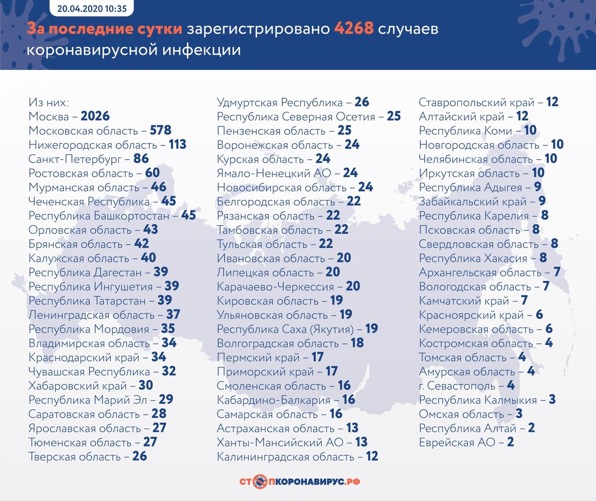 За последние сутки в России подтверждено 4268 случаев коронавирусной инфекции COVID-19 в 76 регионах.